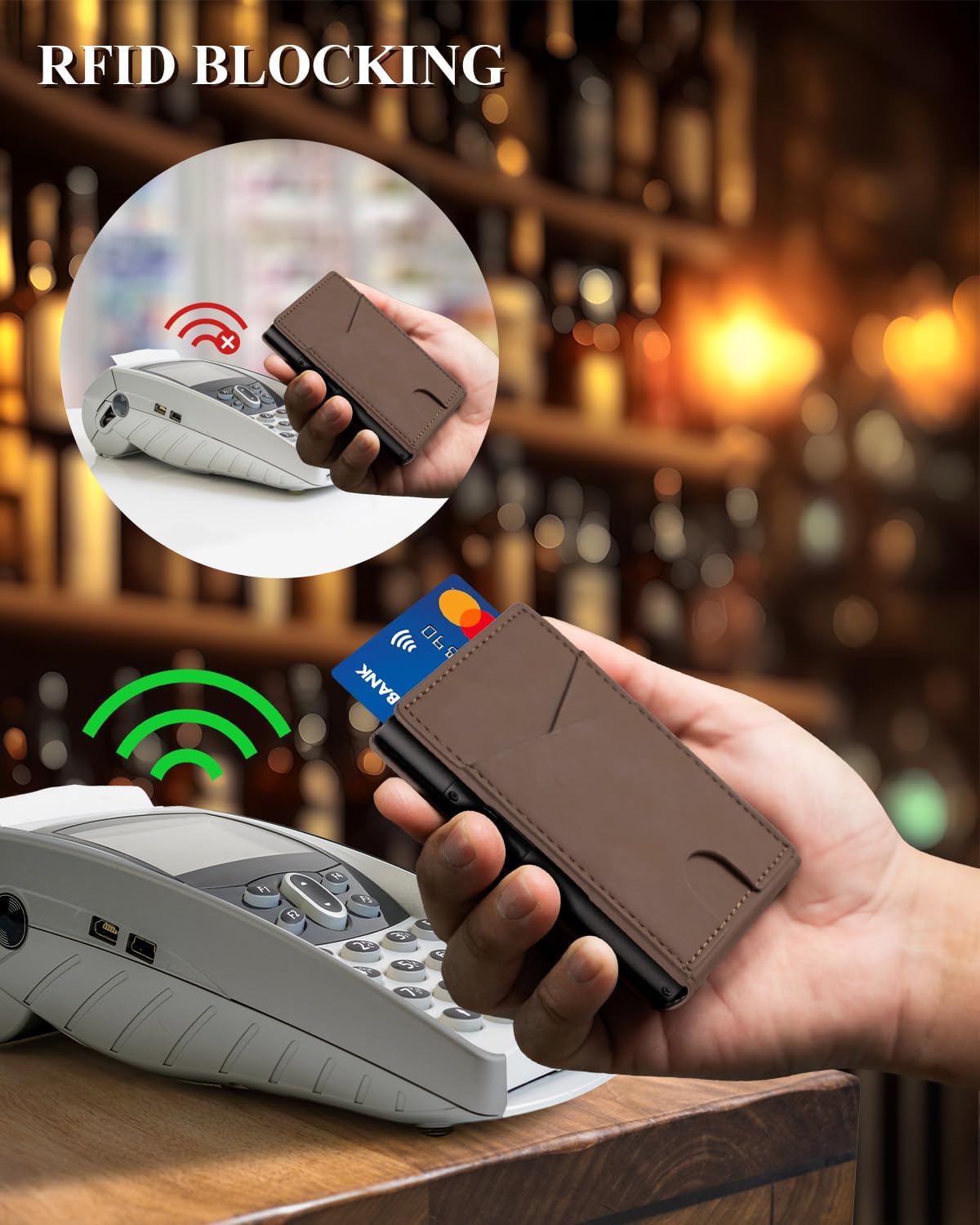 - Convenient POP UP Wallet for Men: With the clever pop up design, you can quick access to any card you need. Just simple slide of the side button of the pop up wallet without much hustle, and without opening the mens wallet, a maximum of 6 cards slide out automatically in staggered form.